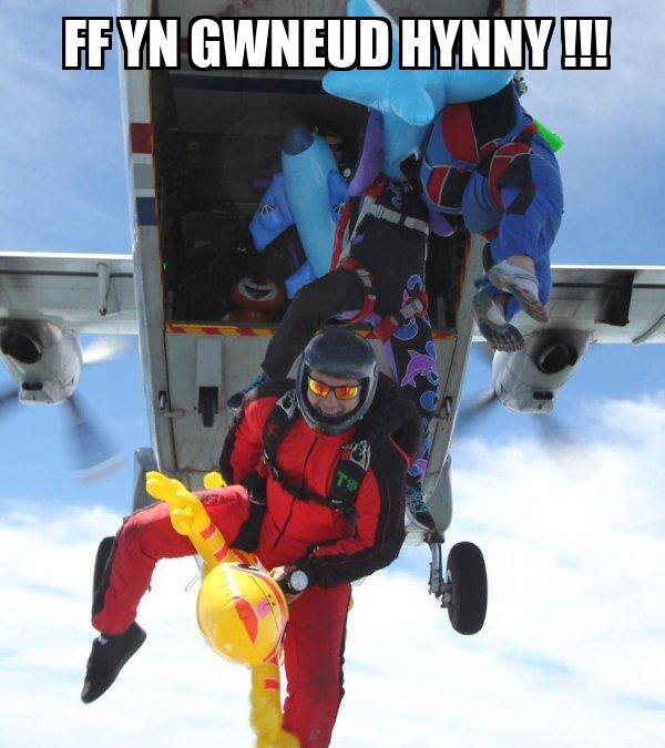 Mae naid parasiwt anhygoel